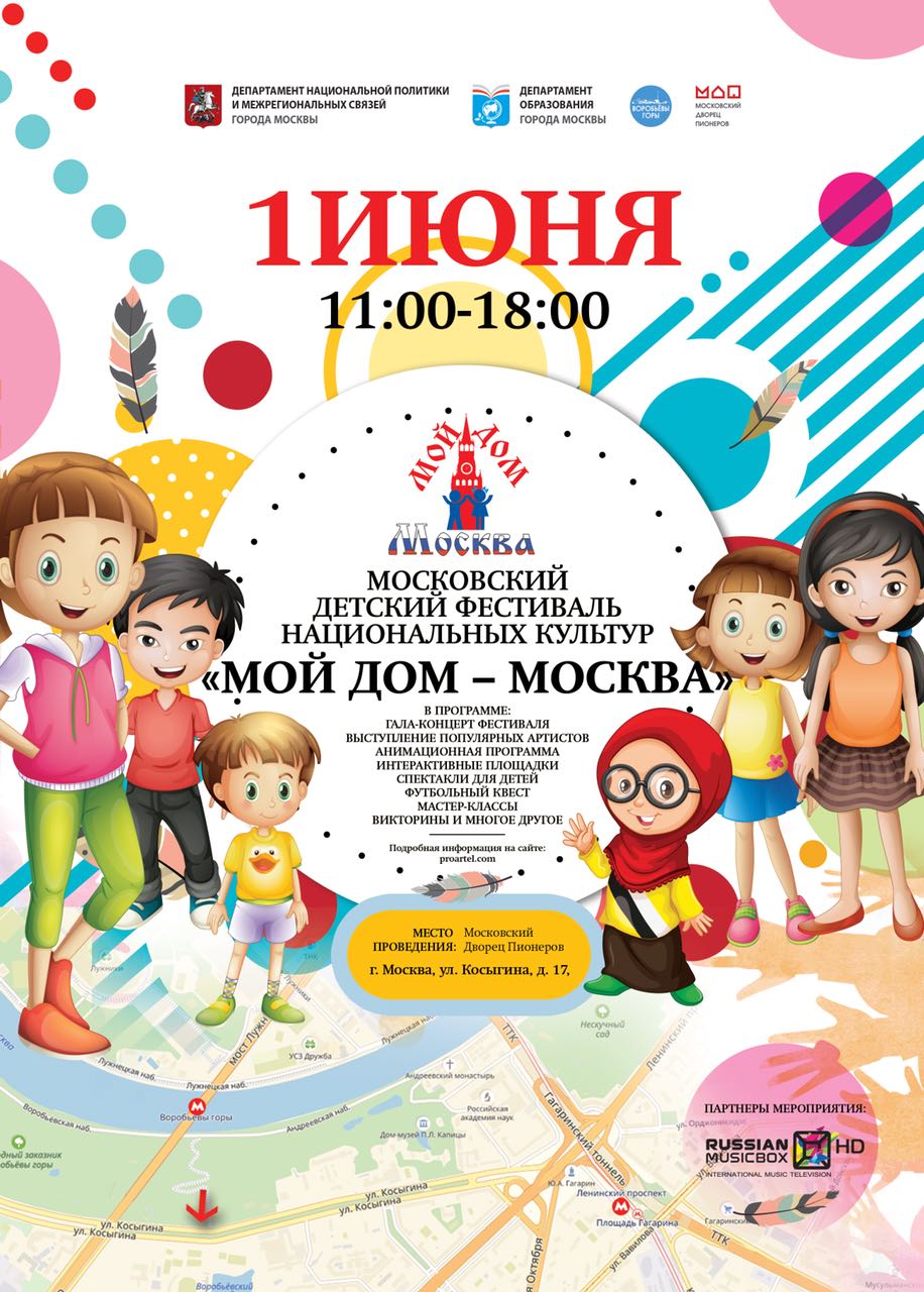 1 июня 2018 года для юных жителей города на площадке Московского Дворца пионеров на Воробьевых горах состоится большой этнокультурный праздник – Гала-концерт Московского детского фестиваля национальных культур «Мой дом - Москва», посвященный Международному дню защиты детей и предстоящему Чемпионату мира по футболу-2018.