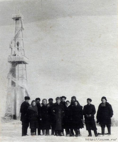 | Главный геолог Лев Ровнин (в центре) в Березово на фоне вышки – первооткрывательницы. 21 сентября 1953г., 65 лет назад, скважина Р-1 известила мир о несметных богатствах Тюменских недр. |