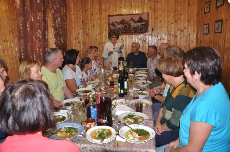 Обед постепенно переходил в ужин, так как сопровождался шутками, чтением стихов, анекдотами и песнями. Слушали незабываемые, прочувствованные стихи Аркадия Ананьевича Харюшина, Анатолия Петровича Ефимова, Ларисы Викторовны Шатуновой. Много было задумок и предложений на будущее. И всё это сопровождалось взрывами смеха и аплодисментами. И, конечно – песни и выступления наших «заводил» Алексея Викторовича Василишина и Виктора Леонидовича Одинцева.