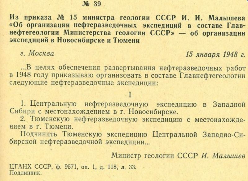 70 лет назад состоялось событие, знаковое не только для Тюменской области, но и для всей страны. 15 января 1948 года министр геологии СССР Илья Ильич Малышев подписал приказ об организации в составе Главнефтегеологии двух нефтеразведочных экспедиций – в Тюмени и в Новосибирске. На нашем портале документ, давший старт геолого-геофизическим исследованиям в Западной Сибири и положивший начало истории тюменской геологии.