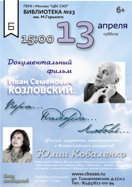 О документальном фильме лауреата международных и всероссийских конкурсов, обладателя «Золотого пера России» Юлии Владимировны Коваленко – «Иван Семёнович Козловский: Вера… Надежда… Любовь» я слышал немало. От неё, от тех, кто уже был знаком с его содержанием. Но одно дело слышать, а – другое видеть собственными глазами.