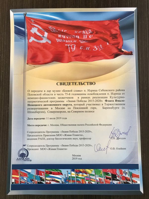 В дар музею «Боевой славы» поселка Идрица был передан флаг Ямало-Ненецкого автономного округа, который участвовал в Торжественном разворачивании в Москве на Поклонной горе, Баренцбурге (о. Шпицберген), Североморске, на Северном полюсе.