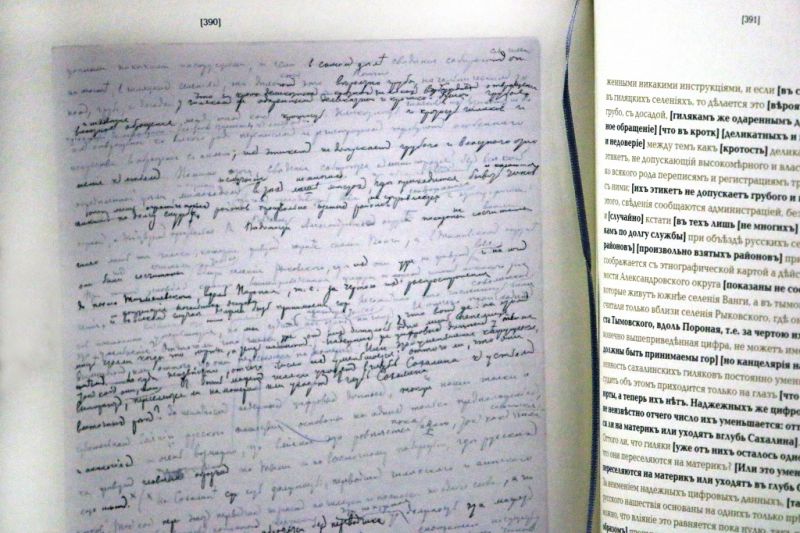 Даже непосвященный в специфику работы экспертов по воспроизведению всех деталей авторской рукописи (стертых, еле заметных и явных, наложенных на предыдущие) может, исходя только из этой цифры, представить себе тот огромный труд, который вложил в проект каждый его участник. Молчанов, между прочим, сказал: «Когда в свое время Чехова спрашивали: “Зачем вы едете на Сахалин?”, он отвечал так: “Вы идете в театр, кто-то читает газету, а я еду на Сахалин”».