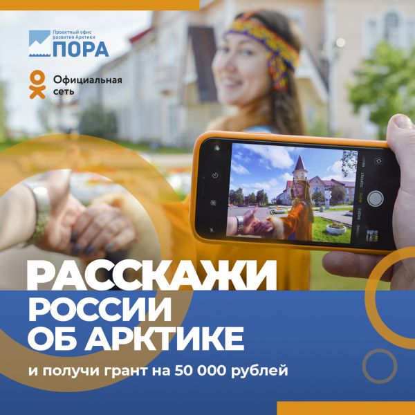 Экспертный центр ПОРА и социальная сеть «Одноклассники» организуют конкурс онлайн-трансляций из арктических регионов России «Расскажи России об Арктике». Каждый совершеннолетний житель Арктики может рассказать о себе и своем родном городе или поселке в прямом эфире. Победители получат гранты 50 тысяч рублей на съемки фильма о своем регионе.