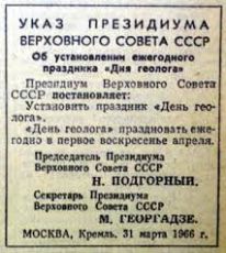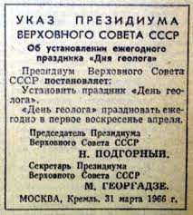 Геологи в некотором смысле были обойдены вниманием. В стране еще в 1935 году был учрежден День шахтера, в 1950 –е - День строителя и День металлурга…В 1965 году уже и нефтяники отметили свой профессиональный праздник…
