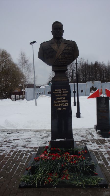 Дважды Герой Советского Союза генерал армии Афанасий Павлантьевич Белобородов (31.01.1903 – 01.09.1990) завещал похоронить его в Подмосковье вместе с бойцами его дивизии - защитниками столицы нашей Родины. Предсмертную просьбу военачальника исполнили - похоронили там, где были остановлены фашистские полчища - вместе с воинами его 9-й гвардейской дивизии.