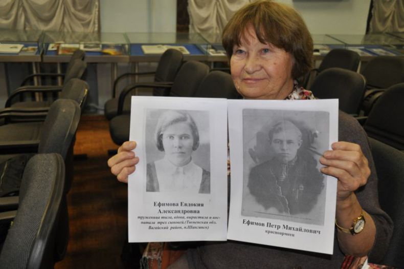 | Супруга Нина с фотографиями родителей Анатолия Ефимова. Первая встреча Бессмертного Западно-Сибирского земляческого полка в Москве, 2017г. |