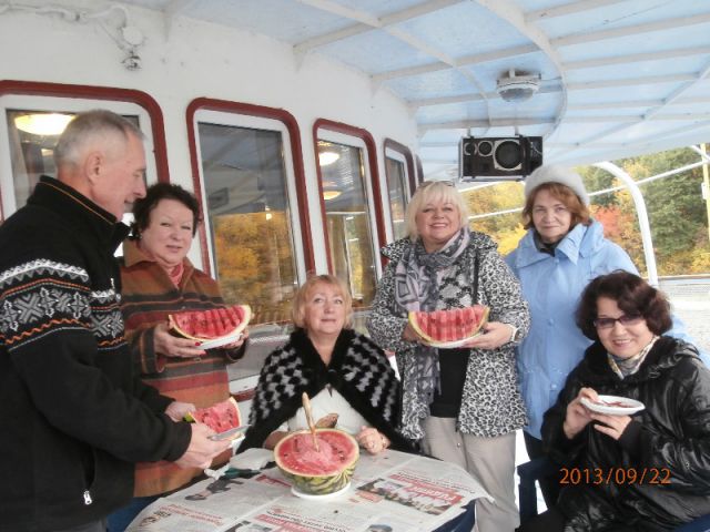 Лето - пора отдыха и новых впечатлений! Уже много лет доброй традицией стали наши путешествия по Золотому кольцу на автобусе и на теплоходе. В честь юбилея клуба мне очень хотелось порадовать наших мадонн новым круизом по Волге! Но, к сожалению, мы не смогли осуществить задуманное – исполнительная дирекция отказалась спонсировать это мероприятие… В наше землячество входят, в основном, пожилые люди, уже много одиноких скромных пенсионерок. Поэтому любое внимание, тем более к юбилею, со стороны назначенного руководства морально и материально поддержало бы им здоровье, а значит – жизнь. Эту поездку очень ждала Надежда Павловна Нефедова, за спиной которой была яркая комсомольская молодость, профессиональный опыт зрелых лет, активная жизненная позиция. Ей так хотелось побольше быть с людьми, отвлечься от грустных мыслей, связанных с болезнями и одиночеством. Не дождалась... А ведь уже установлено, что три дня на теплоходе приравниваются к 9 дням в санатории. Не получилось... И все же 2 наши женщины, Людмила Смолякова и Тамара Храмова с мужем, Геннадием Александровичем, поднакопив денег, реализовали свою мечту.