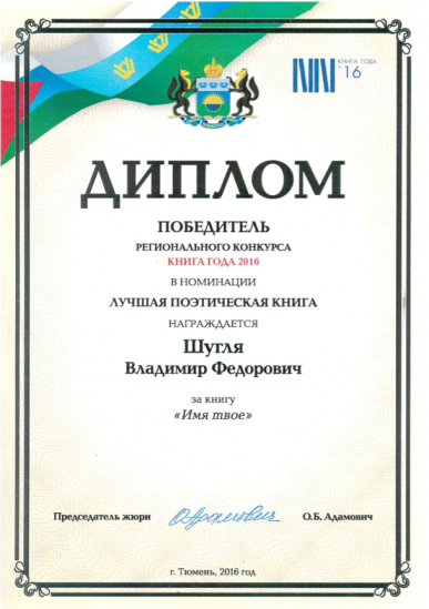Благодарим Вас и читателей поэзии члена Общественной палаты Российской Федерации от Тюменской области, Председателя ТООО «Союз – интеграция братских народов» Владимира Шугли за участие в голосовании в социальных сетях за книги Владимира Федоровича в связи с проводившимся Тюменской областной научной библиотекой имени Д.И.Менделеева литературным конкурсом «Книга года – 2016».