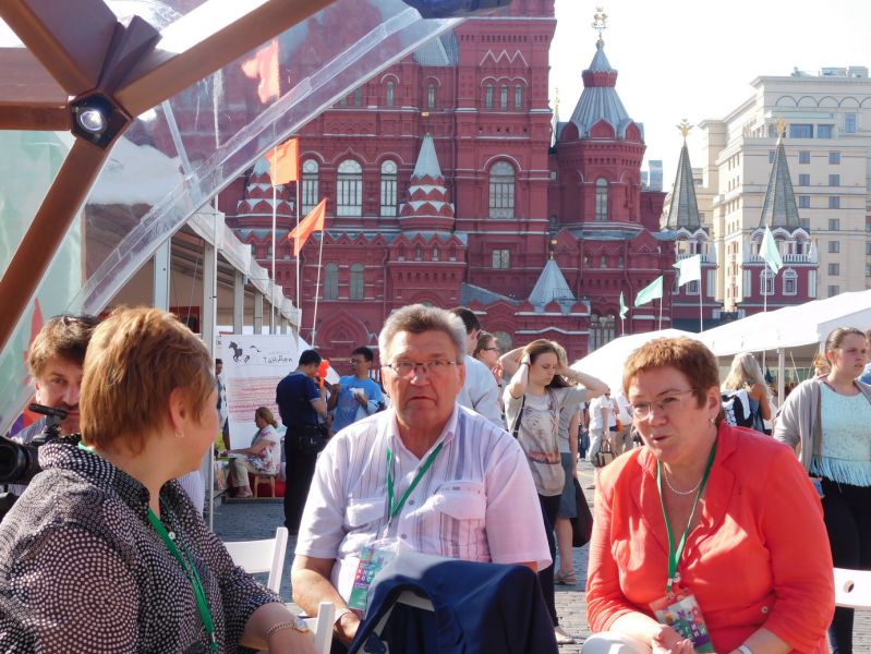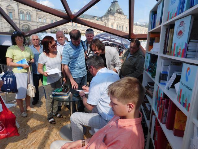 Итак, с утра 25 июня лил дождь. Земляков собралось немного. То ли дождя испугались, то ли оповещение было неполным. Нина Сосова, Галина Столбова, Василий Долгих, Лидия Уланова, Людмила Бялковская, Николай Сизов и я. Вот, кажется, и все. Пошли искать тюменский павильон. Он оказался под №13, у самой Спасской башни, ближе всех к главной сцене, где играл Денис Мацуев с симфоническим оркестром республики Татарстан. Красная площадь утопала в прелестных звуках, капли дождя барабанили по зонту, а глаза тянулись к книжным развалам. Вот они, родные наши «однополчане»: Еремей Айпин, Анатолий Омельчук, Леонид Иванов, Анна Неркаги, Александр Новопашин, Сергей Козлов..! Книги выстроились в ряд, выложены стопочками. А где же сами творцы? Кто-то сказал: «Пошли в ГУМ на пресс-конференцию». Надо же послушать! Кинулась туда. Где? Во сколько? На каком этаже? На какой линии? Но… не было там никакой конференции. Ребята просто разошлись пообедать. Фантазеры!