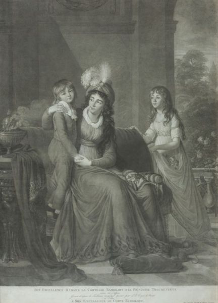 Семейным счастьем одарила судьба и графа Николая Дмитриевича Зубова (1801 – 1871). Но… недолгим. У него была красавица жена – в православии Александра Гавриловна, дочь французского эмигранта Раймона де Моден. Трое очаровательных детей – девочка Елизавета и двое мальчиков: старший Николай и младший Александр. И грянуло горе: умирает жена, оставив на руках безутешного мужа шестилетнюю Лизу, семилетнего Николая и младенца Сашу. Знаменитый график Ноэль, упоминаемый Пушкиным в «Евгении Онегине», создает по заказу графа Зубова исполненный печали семейный триптих в технике литографии с акварельного оригинала итальянского художника Росси.