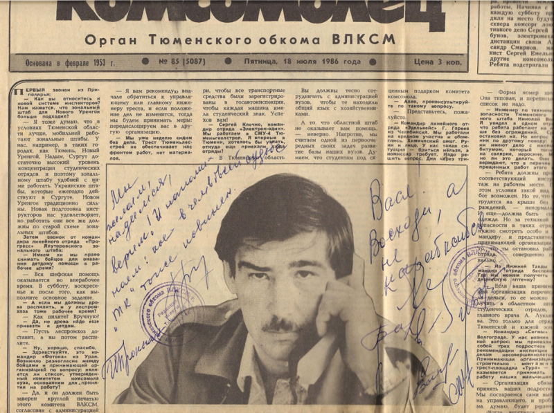 В 1982–1984 годах в должности Первого секретаря Центрального РК ВЛКСМ г.Тюмени я занимался формированием ССО в Тюменском индустриальном институте, Тюменском государственном университете, Тюменском сельскохозяйственном институте. Начальники штаба трудовых дел индустриального института Александр Мажаров и Сергей Клюев в последующем стали командирами Тюменского областного студенческого отряда.