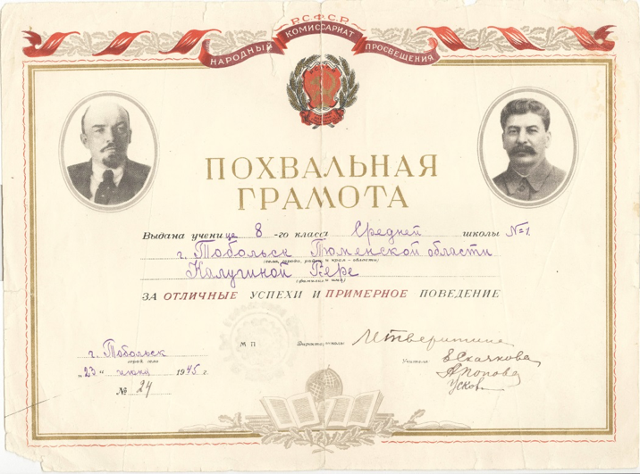 Носила подшитые старые валенки, ситцевый халат серого цвета. Так как росла, мама куском сатина синего цвета (другого материала не было) наставляла рукава и подол. Я очень стеснялась этой одежды, гордилась лишь алым пионерским галстуком, завидуя только одной девочке из Ленинграда, у которой был шелковый, а не сатиновый, как у меня. Сохранились по сей день и мои табели, и похвальные грамоты военной поры.