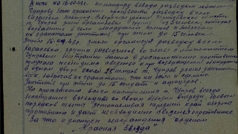 …Выполняя задания командования и организуя разведку, командир взвода т. Чупров бесстрашно заходит в расположение противника, получает необходимые сведения и, обнаружив 15, а затем и 25 человек врага, уничтожает их (Черниговская область).
