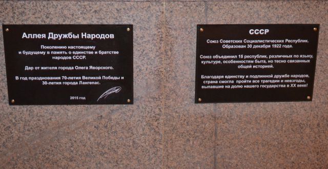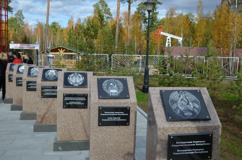 Идея открытия Аллеи дружбы народов принадлежит местному предпринимателю Олегу Яворскому, который решил таким вот комплексом воздать дань тому периоду жизни нашей страны, когда она была едина и могущественна. Идею поддержали в администрации города, в разработке проекта оказал содействие директор Музейно-выставочного центра Андрей Дробышев. А реализовали, как говорится, всем миром. Многие предприятия приняли участие в создании Аллеи, окружное правительство помогло средствами. Главный символ СССР - герб державы, гербы пятнадцати союзных республик и стилизованная Спасская башня Московского Кремля - вот составляющие комплекса.