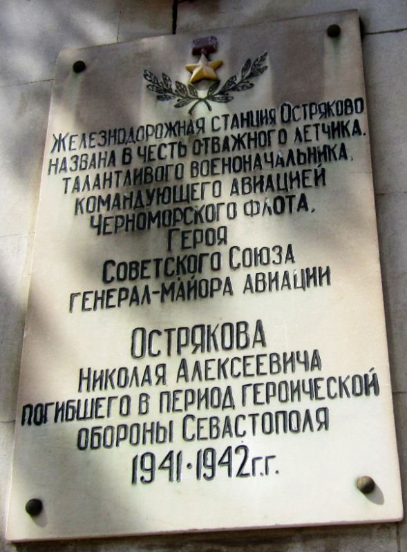 Позднее на политзанятиях мы узнали, что наша станция названа в честь отважного летчика, талантливого военачальника, Командующего Авиацией Черноморского флота, Героя Советского Союза, генерал-майора авиации Николая Алексеевича Острякова, погибшего в период героической обороны Севастополя 1941-1942 годов. В привокзальном скверике его бюст, к сожалению, в нарушение всех законов пропорции несуразно установлен сегодня на постаменте, оставшемся после сваленной во времена ХХ партсъезда статуи Сталина.